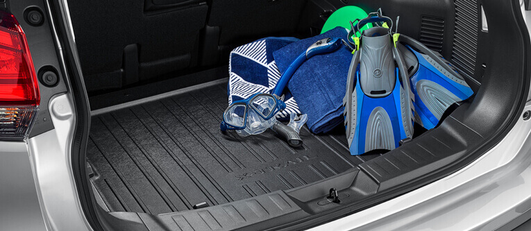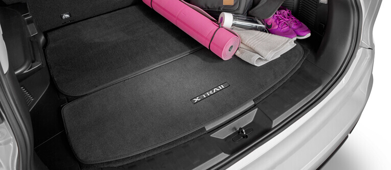 - X-TRAIL branded black formed tray, designed with a raised outer perimeter to help protect the cargo floor area and contain any spillages